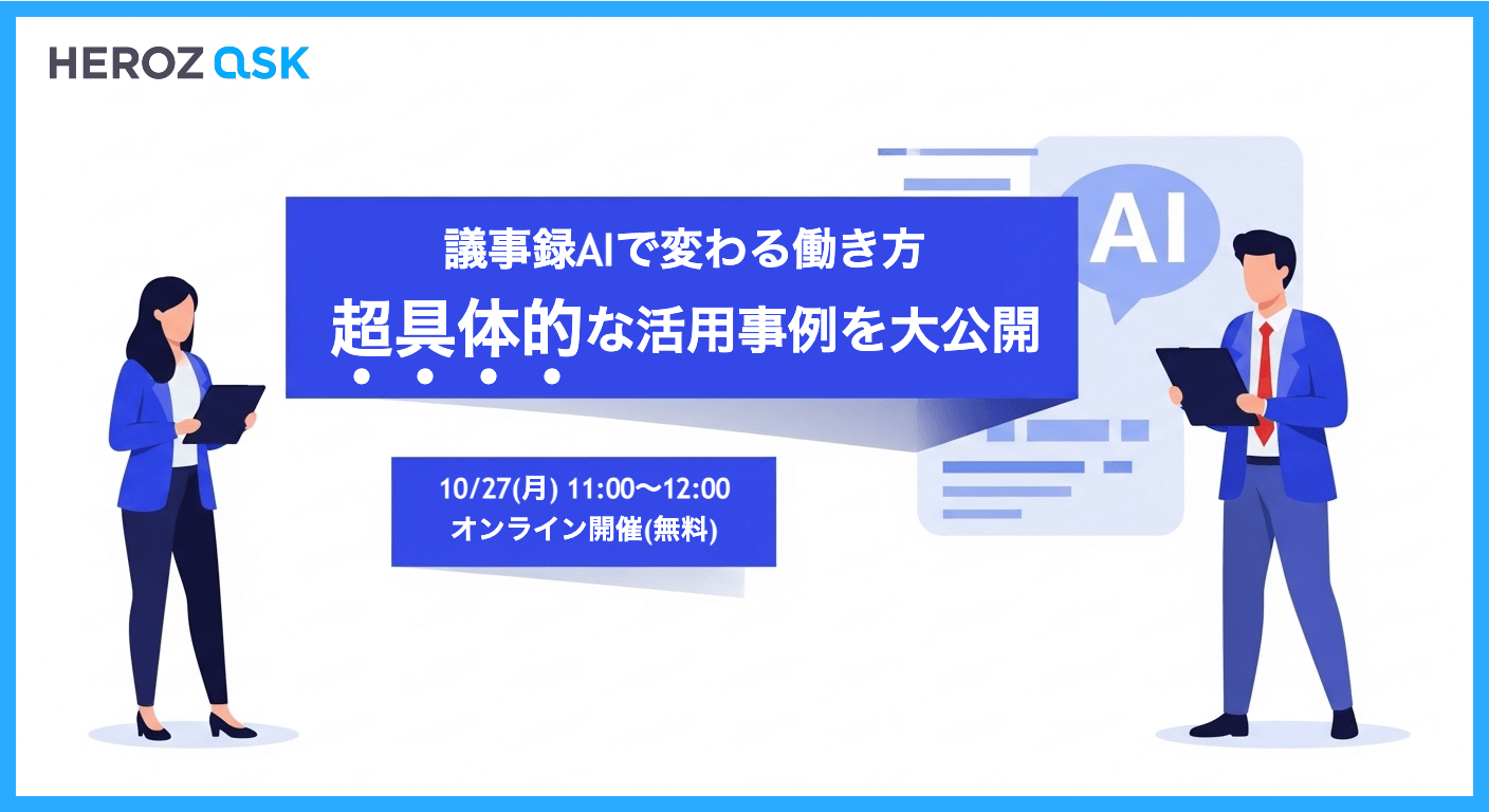 10/27(月)11:00より、HEROZ主催で、議事録AIを活用した具体的な業務効率化について解説いたします。現場で“今日から使える”ノウハウを、概要の理解から具体的な活用事例まで凝縮して60分で解説します。