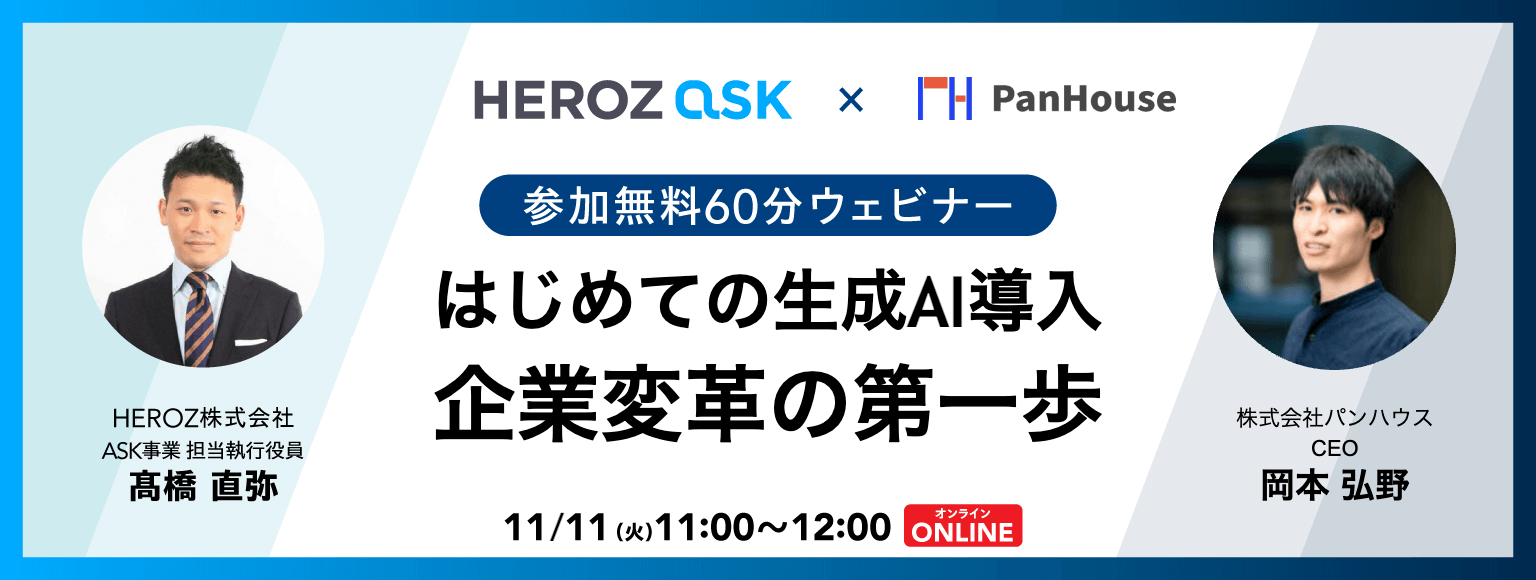 11/11(火)11:00より、HEROZとパンハウス社共催で、「はじめての生成AI導入:企業変革の第一歩」をテーマにウェビナーを開催いたします。
